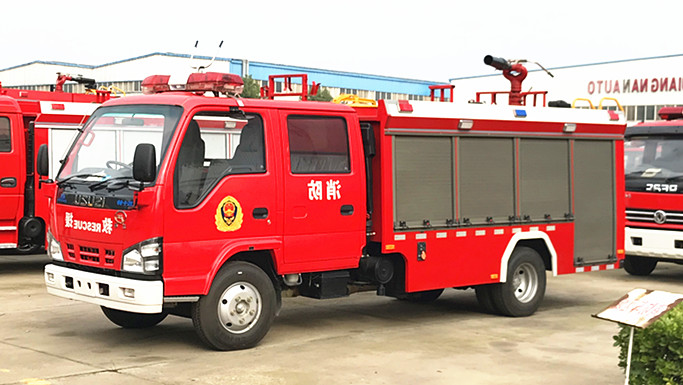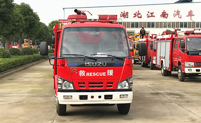 JDF5070GXFSG20/Q6水罐消防车,采用五十铃QL1070A5HWY底盘改装而成。整车由消防员乘员室和车身两大部分组成,乘员室为原装双排,可乘坐2+3人,该车为内仓罐结构,车身前部为水罐+器材箱,后部为泵房。载液罐体为优质碳钢,与底盘采用弹性连接,载水2000kg,,装备了上海雄真消防设备有限公司生产CB10/30-XZ型消防泵,额定流量30L/S,车顶安装成都威斯特消防机械有限公司生产的PL24型车用消防炮。该车最大的特点是机动灵活、操控性好、维修简便。可广泛应用于公安消防队、厂矿企业及社区、码头等场所,扑救一般物质火灾非常的有限快捷方便。