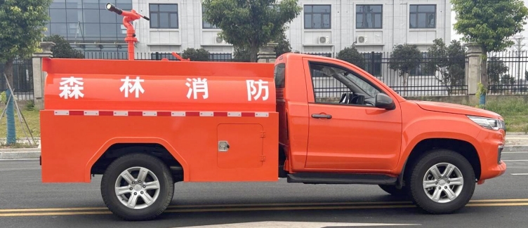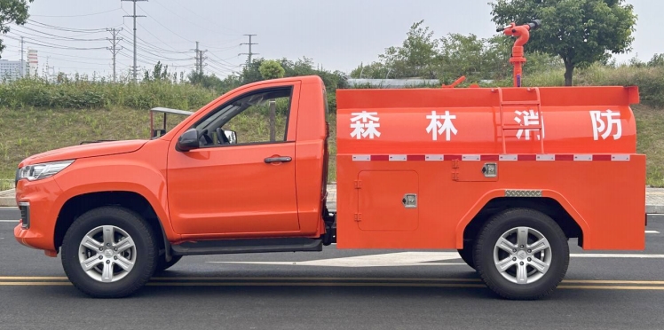 单排森林消防洒水车:窄车身设计(宽度<2.1m)可深入丛林窄道,前置喷水系统精准压制地表火源,后置洒水炮覆盖树冠火。